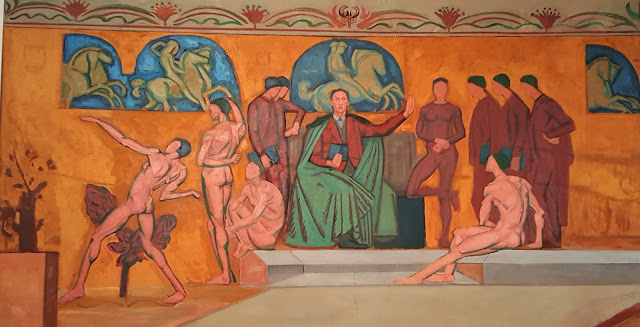 Backa tillbaka cirka 100 år och det är inte en singelkille med handen i byxfickan som blickar tillbaka. Nej, nej, här är det elitism så det ryker om det. Förslaget är Georg Paulis. Unga män, ansiktslösa, perfekta kroppar (och sinnen) att forma för det enda ansiktet som träder fram. Ledaren som ska förena en sund kropp i en sund själ är naturligtvis en man även det. Skissen är gjord för Jönköpings läroverk 1912. Allmän rösträtt och två världskrig väntar om hörnet.